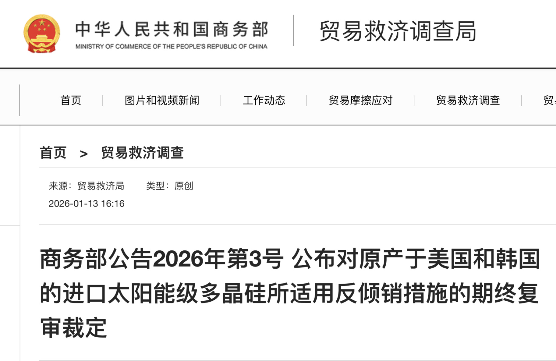 MOFCOM Announcement No. 3 of 2026: Final Determination of the Expiry Review on Anti-Dumping Measures Applicable to Imports of Solar-Grade Polysilicon Originating in the United States and the Republic of Korea