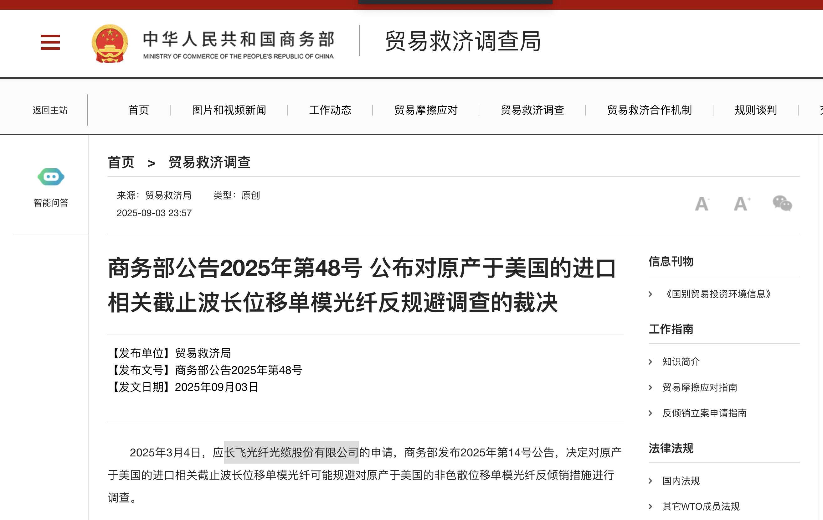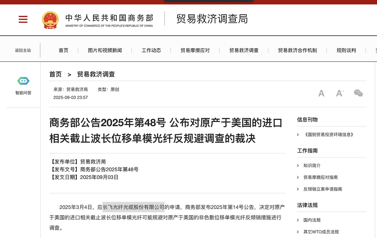[Date of Issuance] September 3, 2025On March 4, 2025, at the request of Yangtze Optical Fibre and Cable Joint Stock Limited Company, the Ministry of Commerce (MOFCOM) issued Announcement No. 14 of 2025, deciding to initiate an investigation into whether imports of certain cut-off shifted single-mode optical fiber originating in the United States were circumventing the anti-dumping measures imposed on imports of dispersion unshifted single-mode optical fiber from the United States.