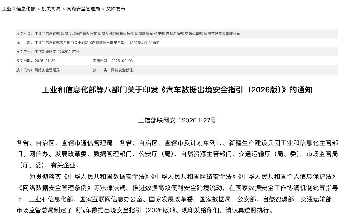 In order to implement the Data Security Law of the People’s Republic of China, the Cybersecurity Law of the People’s Republic of China, the Personal Information Protection Law of the People’s Republic of China, the Regulations on the Security Management of Network Data, and other relevant laws and regulations; to promote the secure, efficient, and orderly cross-border flow of data; and under the overall coordination and guidance of the national data security coordination mechanism, the Ministry of Industry and Information Technology (MIIT), together with the Cyberspace Administration of China (CAC), the National Development and Reform Commission (NDRC), the National Data Administration, the Ministry of Public Security, the Ministry of Natural Resources, the Ministry of Transport, and the State Administration for Market Regulation, has formulated the Guidelines on the Security of Cross-Border Transfers of Automotive Data (2026 Edition).