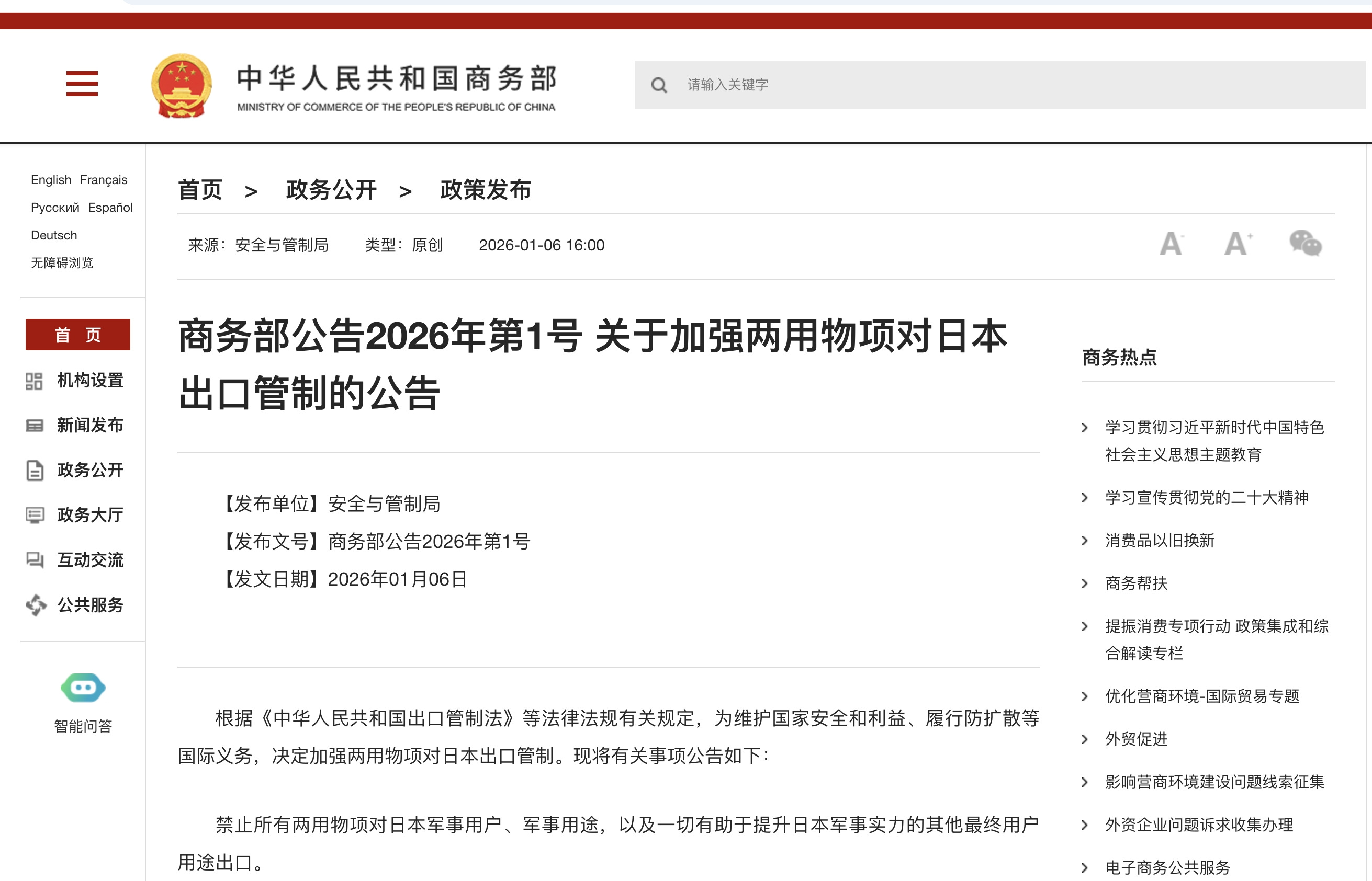 On January 6, the Ministry of Commerce (MOFCOM) issued Announcement No. 1 of 2026, prohibiting the export of all dual-use items to Japan for military end users, military purposes, and any other end uses that could contribute to enhancing Japan’s military capabilities.