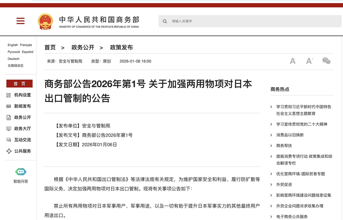 Question: On January 6, 2026, the Ministry of Commerce announced strengthened export controls on dual-use items to Japan. What considerations led to this decision?