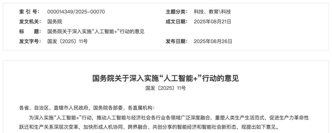 The State Council of China released its Opinions on Deeply Implementing the “Artificial Intelligence Plus” Action.
