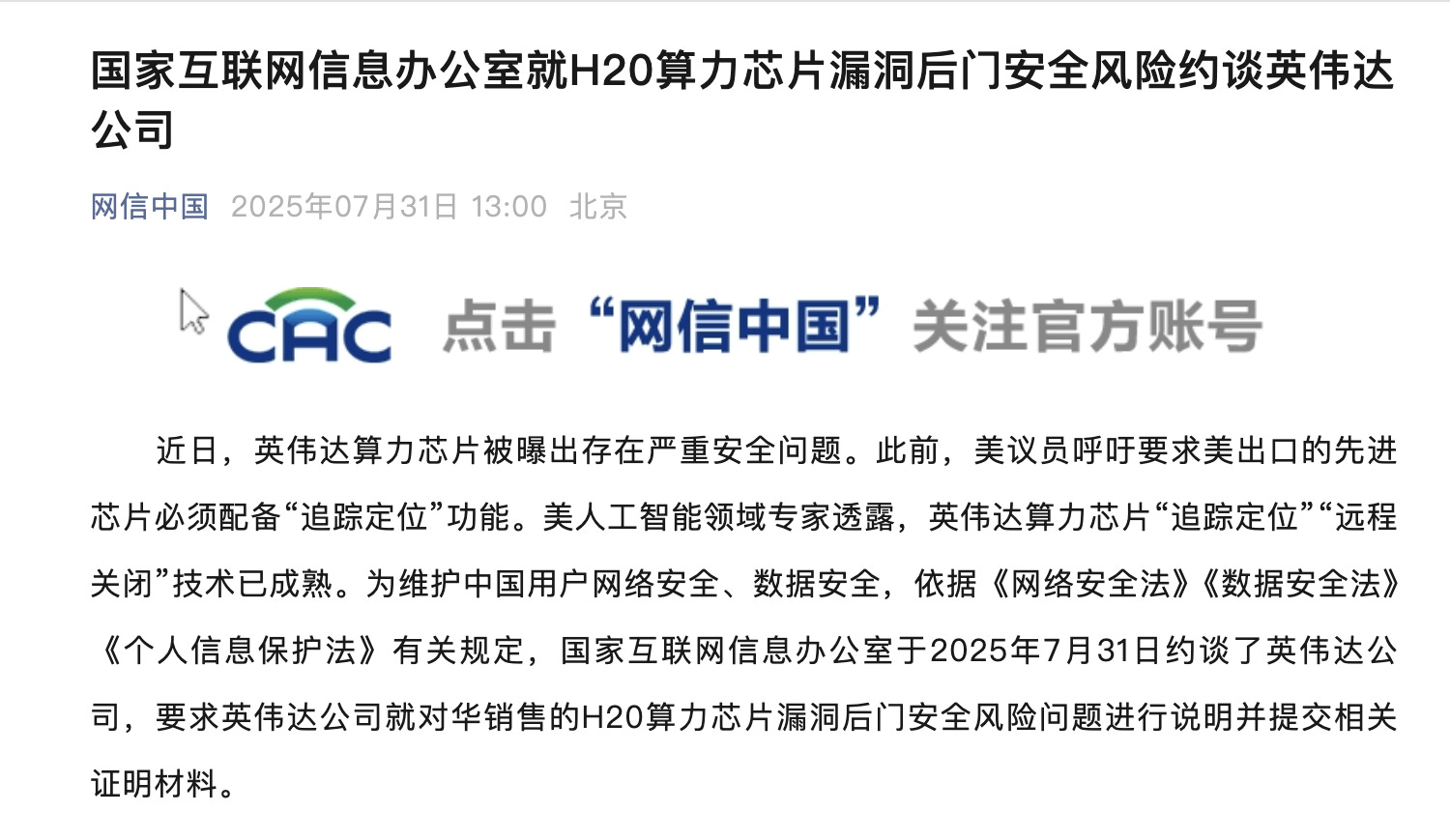 Today, a story about Nvidia's H20 chip is blowing up all over Chinese social media. China's top cyber regulator, the Cyberspace Administration of China (CAC), summoned (约谈) Nvidia for a talk about "security risks from vulnerabilities and backdoors in the H20 computing chip."