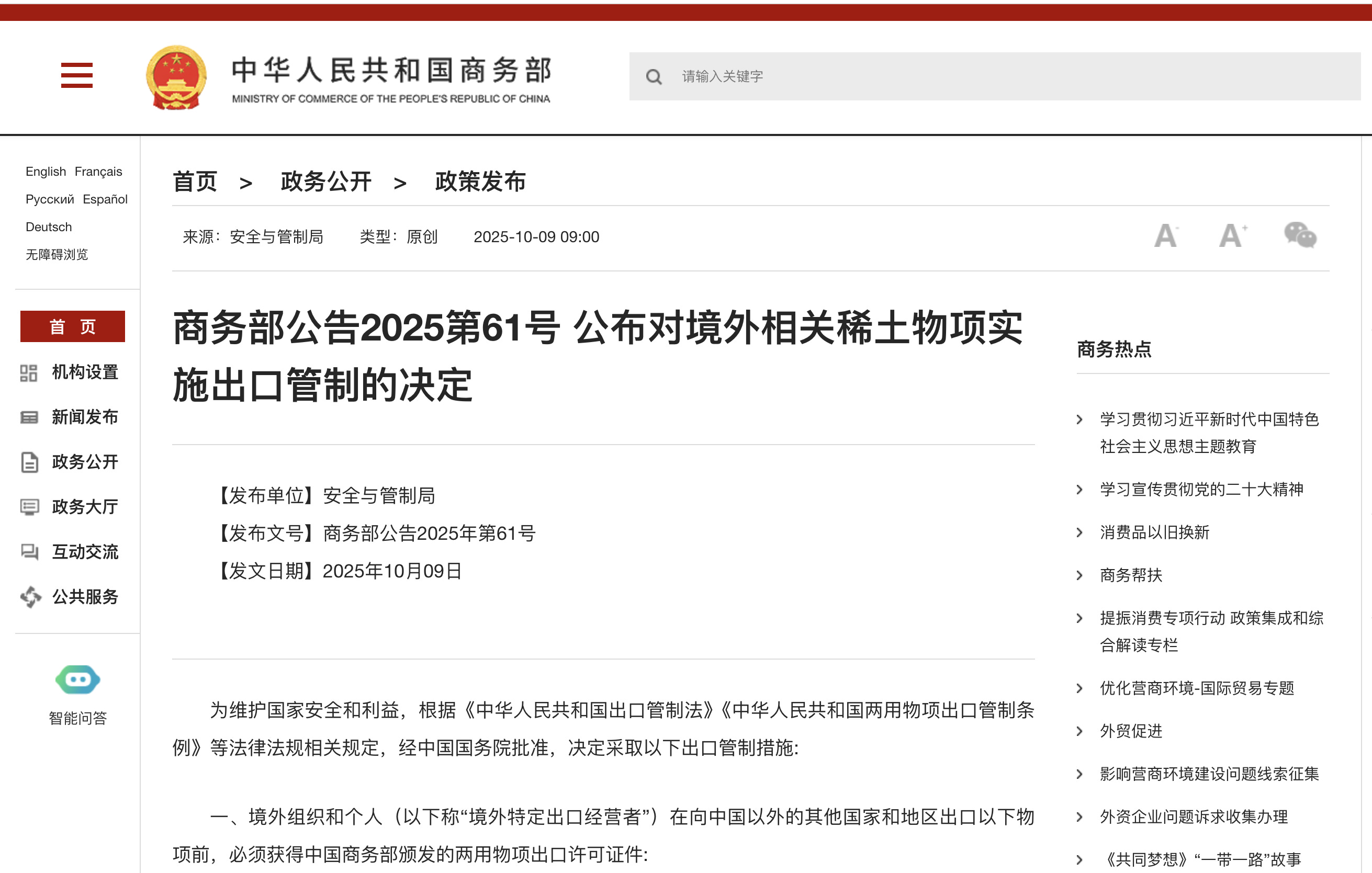 4. MOFCOM Announcement No. 62 of 2025 (effective October 9, 2025): Imposes export controls on technologies related to rare earth mining, smelting, separation, metal refining, magnet production, and secondary resource recycling, further defining what constitutes “export” behavior.