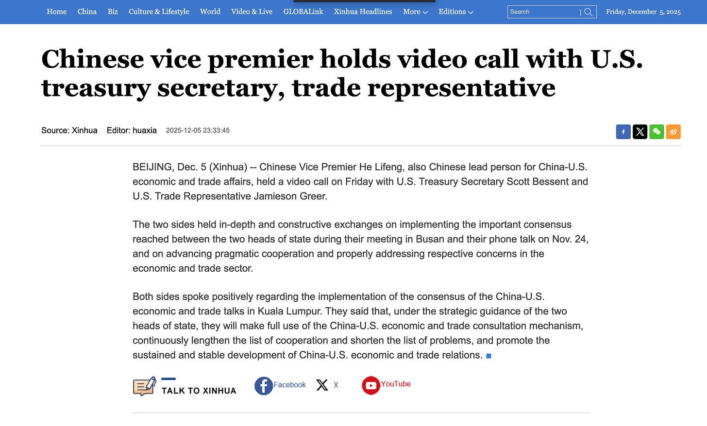 BEIJING, Dec. 5 (Xinhua) -- Chinese Vice Premier He Lifeng, also Chinese lead person for China-U.S. economic and trade affairs, held a video call on Friday with U.S. Treasury Secretary Scott Bessent and U.S. Trade Representative Jamieson Greer.