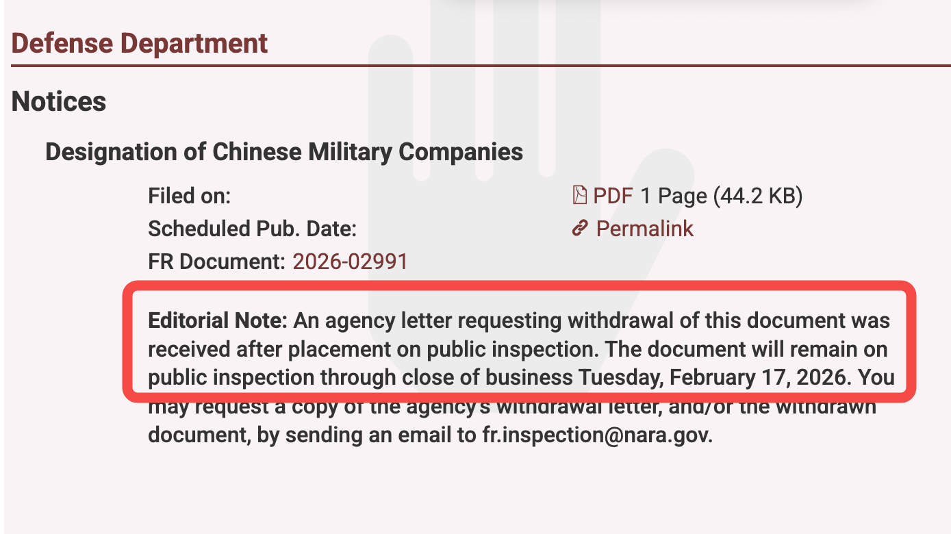 However, less than an hour later, the update disappeared. The latest notice on the Federal Register indicates that following the list’s publication, the Department of Defense received an interagency letter requesting its withdrawal. The document will remain publicly viewable until February 17, 2026.