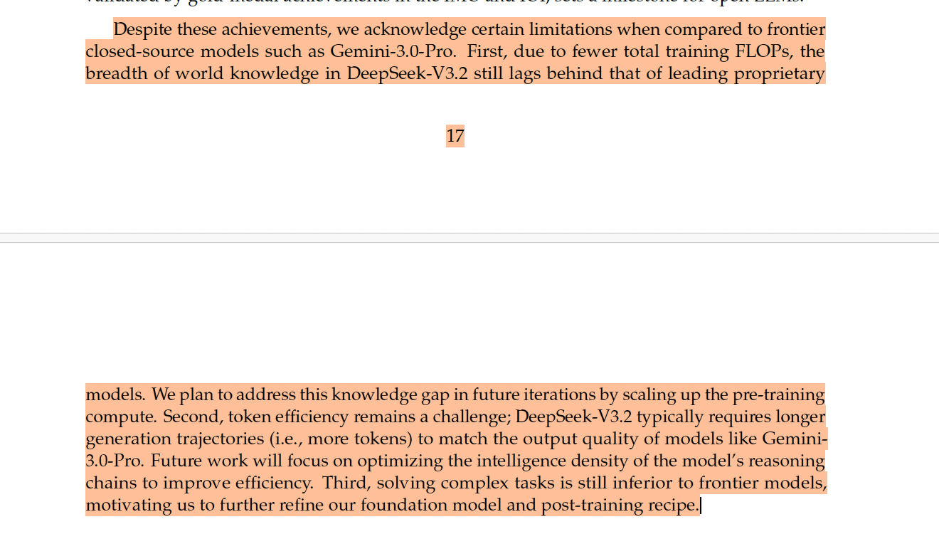 DeepSeek also acknowledges its shortcomings, especially when compared with frontier proprietary models such as Gemini 3.0 Pro.