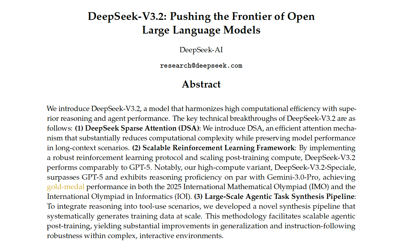 On December 1, 2025, exactly three years after the launch of ChatGPT, DeepSeek dropped a major surprise at this symbolic moment as the V3.2 model officially went live. The technical report is available.