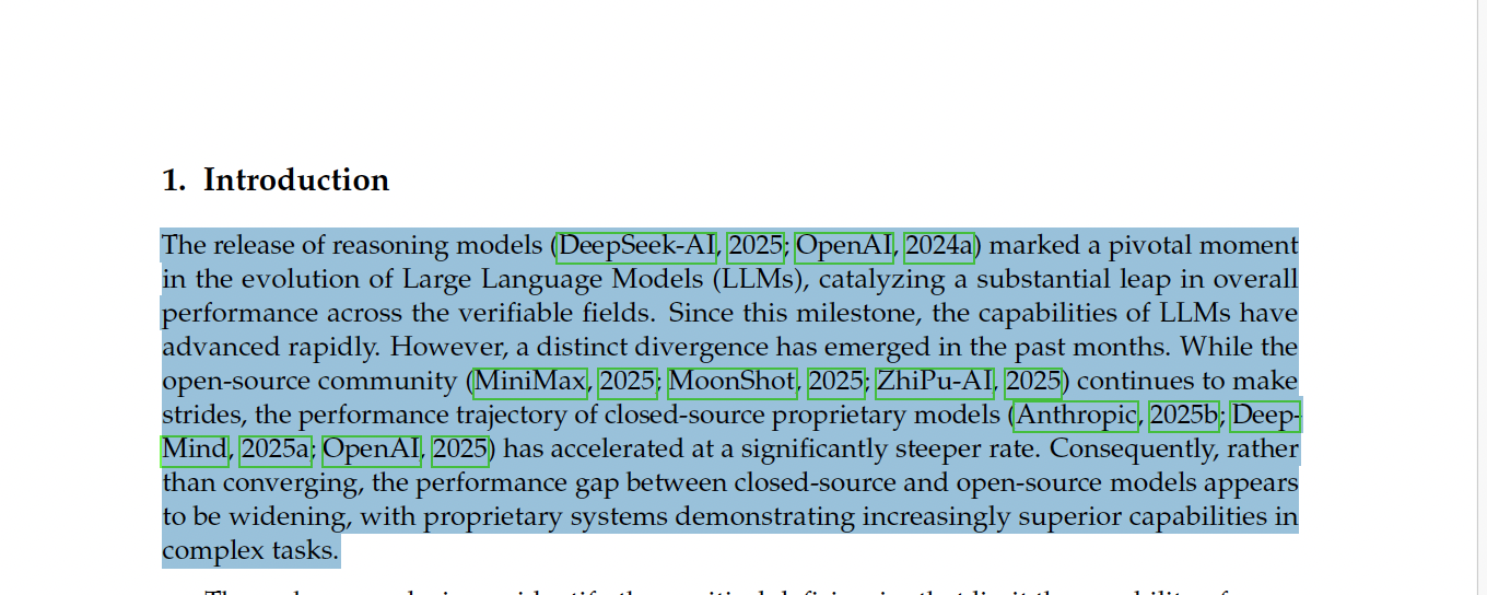 However, a distinct divergence has emerged in the past months. While the open-source community (MiniMax, 2025; MoonShot, 2025; ZhiPu-AI, 2025) continues to make strides, the performance trajectory of closed-source proprietary models (Anthropic, 2025b; Deep Mind, 2025a; OpenAI, 2025) has accelerated at a significantly steeper rate. Consequently, rather than converging, the performance gap between closed-source and open-source models appears to be widening, with proprietary systems demonstrating increasingly superior capabilities in complex tasks.