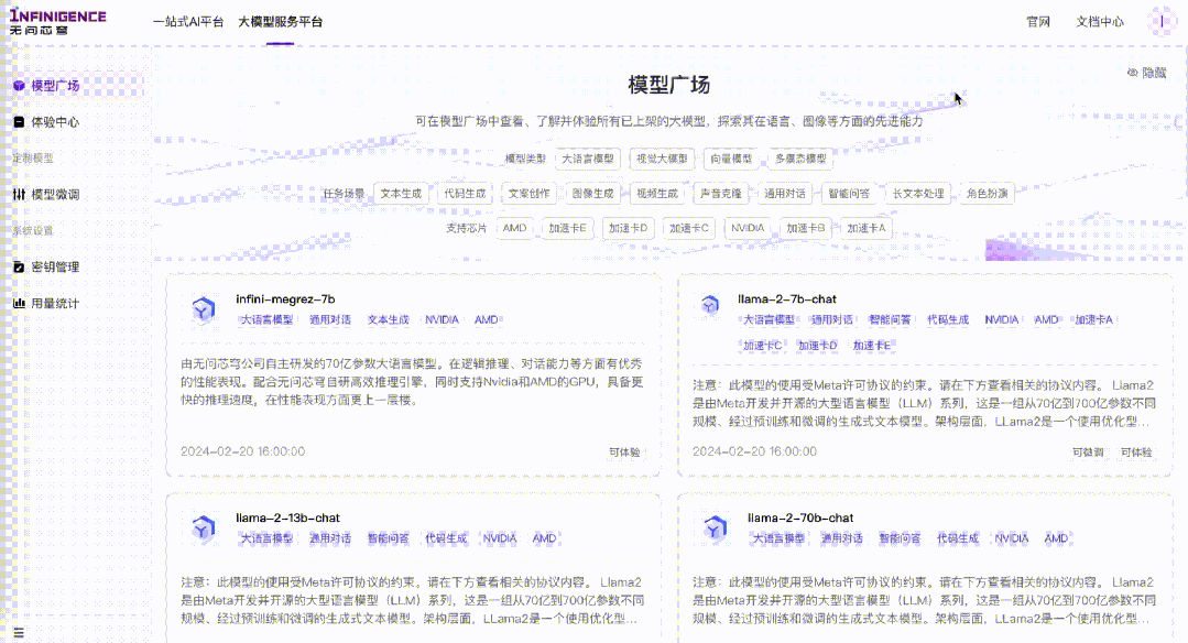 Currently, "Wuwen Xinqiong's" "Infini-AI" platform supports over 20 models, including Llama2 and Baichuan2, as well as more than ten types of computing cards from AMD, Wallston, Cambricon, Suiyuan, Tianshu Zhixin, Muxi, Moore Threads, Nvidia, and others.