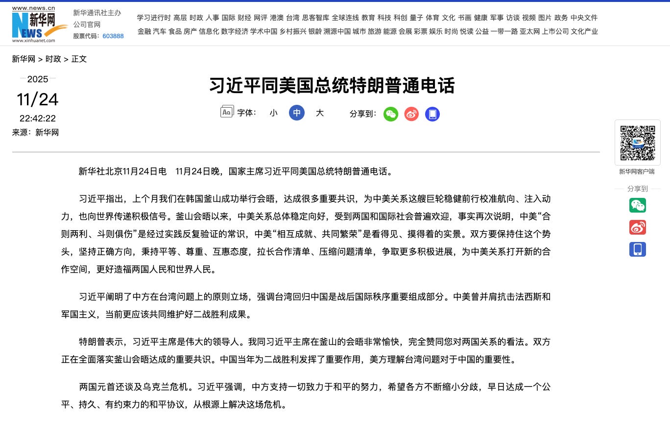 新华社北京11月24日电 11月24日晚,国家主席习近平同美国总统特朗普通电话。